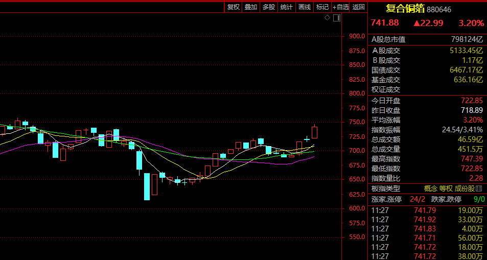 复合铜箔早间逆势高开高走,板块指数盘中一度放量涨近4%,半日成交超昨日全天成交。